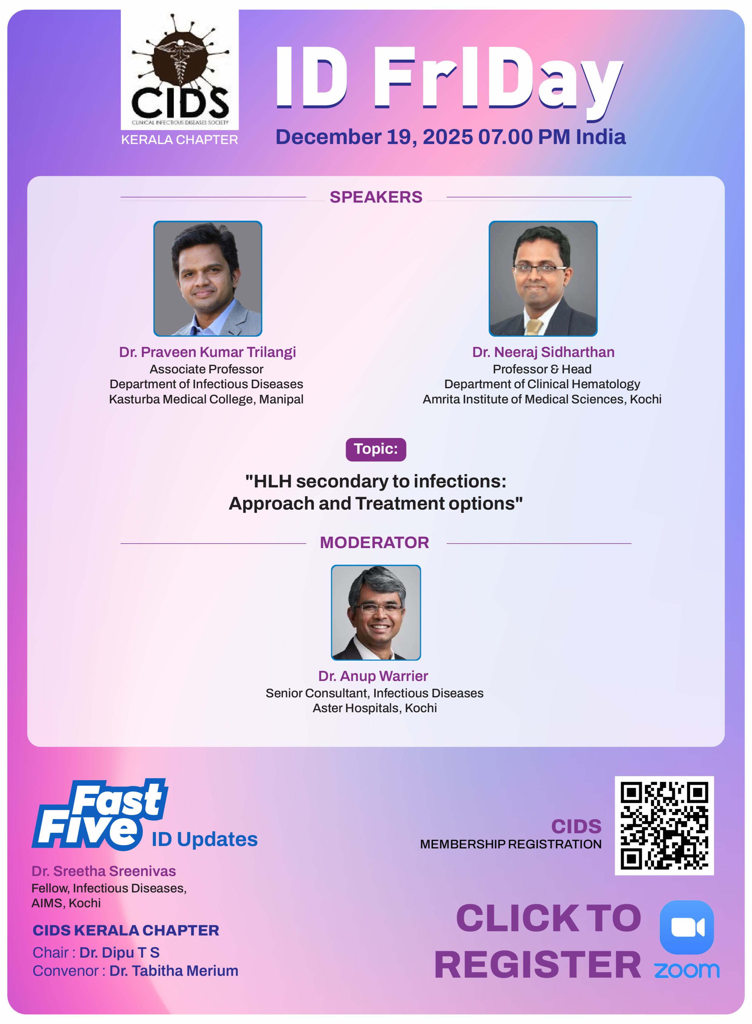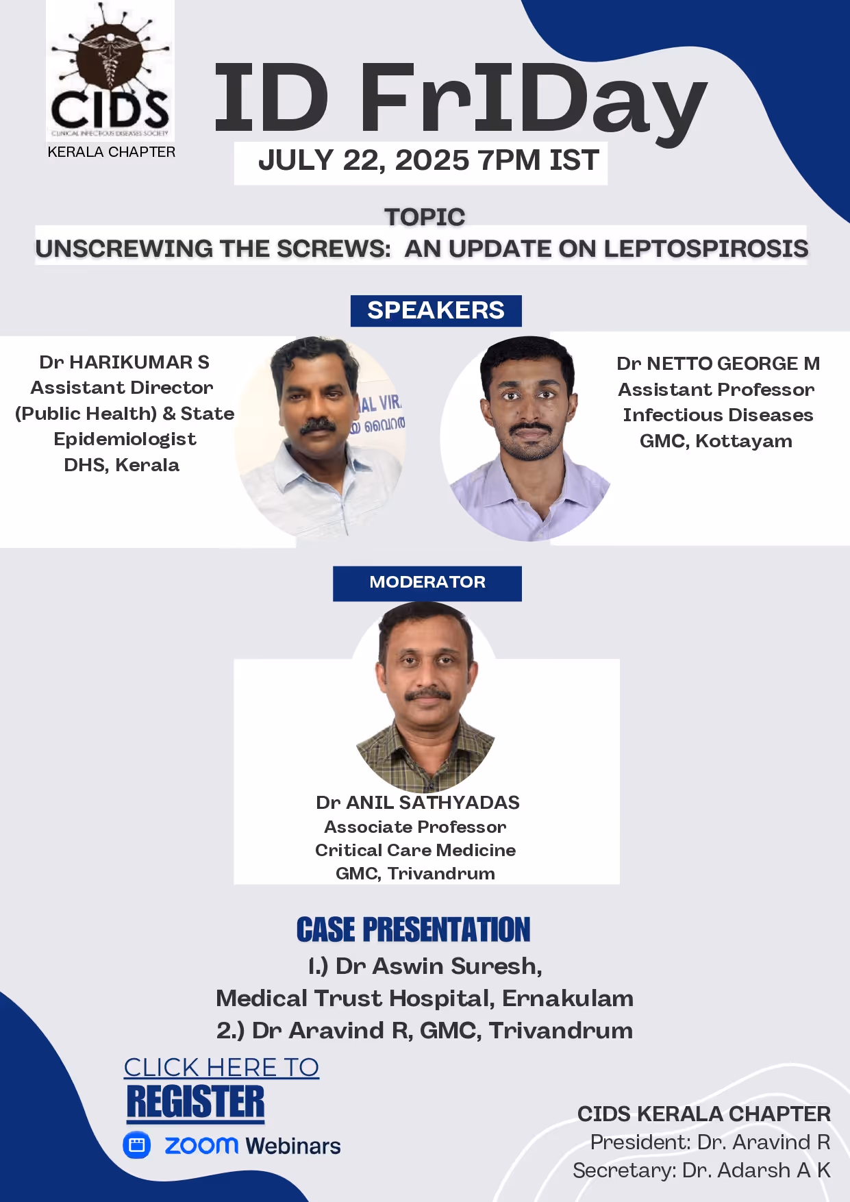 The CIDS Kerala Chapter, established in 2021, hosts a monthly educational event known as ID FrIDay. This online program occurs every month on the first or second Friday with the aim of promoting infectious diseases (ID) awareness in Kerala and beyond. The session features a lecture, a succinct review of 5 journal articles, and a challenging ID case discussion. Moving forward, the CIDS Kerala Chapter intends to broaden its scope by engaging in relevant research within the realms of infectious diseases, antimicrobial stewardship, and infection control.